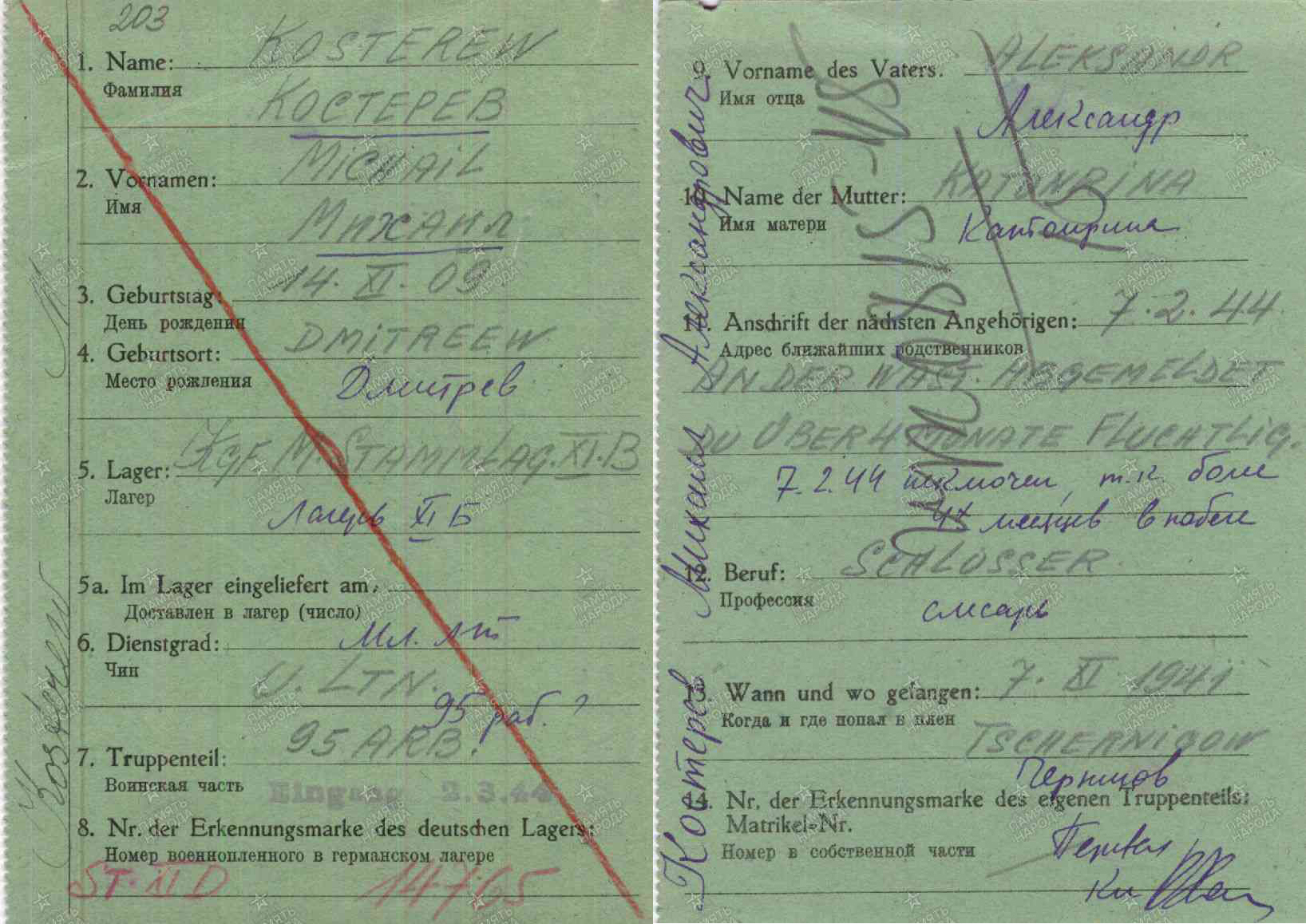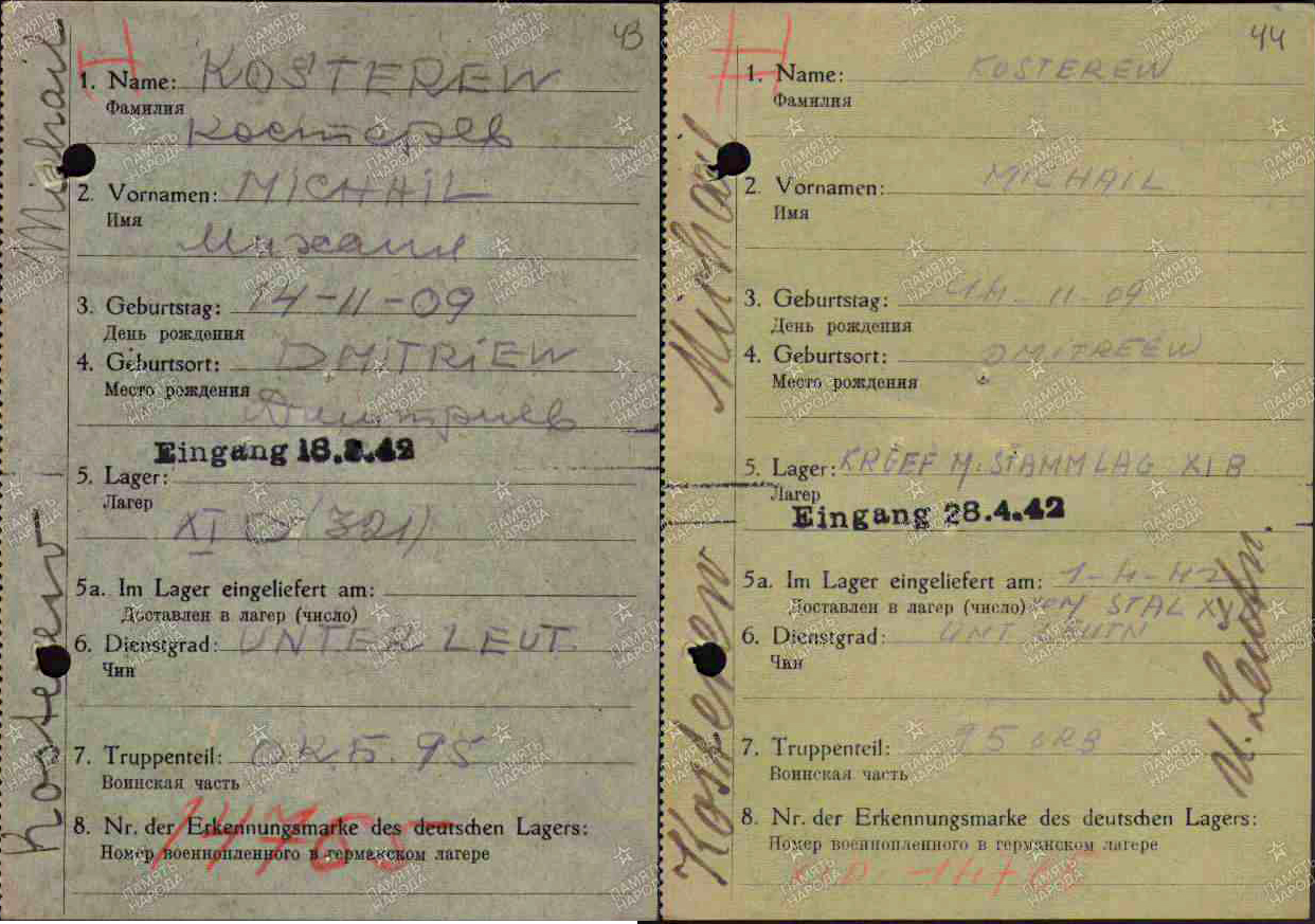В октябре 1941 года Костерева под номером 14765 перевезли в Германию, в шталаг 321 Эрбке, расположенный в Нижней Саксонии в 50 километрах на север от Ганновера. В ноябре в лагере находилось примерно 14 000 военнопленных. С ноября 1941 по февраль 1942 лагерь изолирован из-за эпидемии сыпного тифа. За это время 12 000 военнопленных умирают от голода, холода и болезней. 1 и 2 апреля 1942 года оставшиеся в живых пленные были переведены в шталаг XI B Бад-Фаллингбостель. Шталаг IX-B был административным центром для военнопленных, работавших в регионе. На пике своего развития он насчитывал около 80 000 военнопленных, которые работали в 1500 трудовых командах в сельском хозяйстве и промышленности. Именно из такой команды, судя по лагерной карте военнопленного, Михаил Костерев в октябре 1943 года совершил побег. Во всяком случае, 7 февраля 1944 года он был снят с учета как «находящийся более 4-х месяцев в побеге». Конечно же, выжить на северо-западе Германии шансов у Костерева не было. Скорее всего, он погиб во время одной из облав. Но умер свободным.